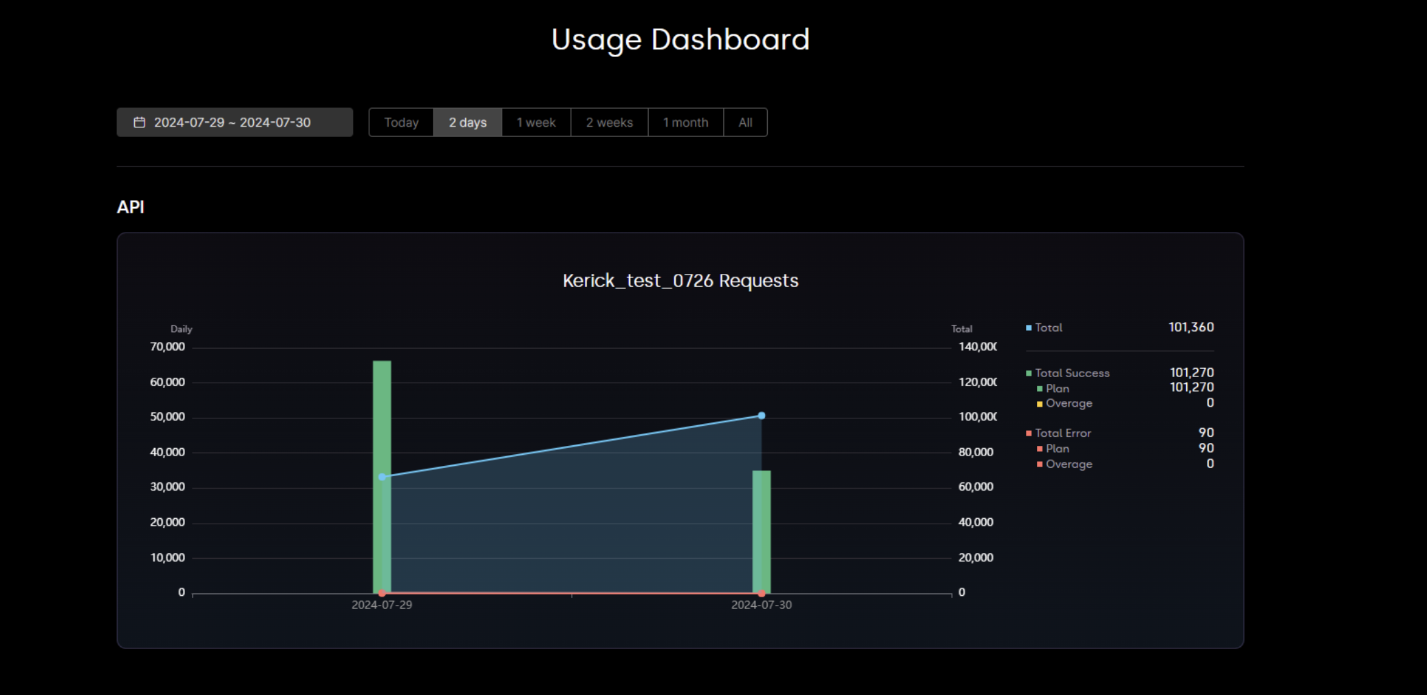 API usage can be monitored in real-time through the usage graph. Both daily usage and cumulative usage are displayed, and the graph adjusts according to the specified time filter. On the left side of the graph, you can see the values for daily data usage, while on the right side, you can view the cumulative usage values.